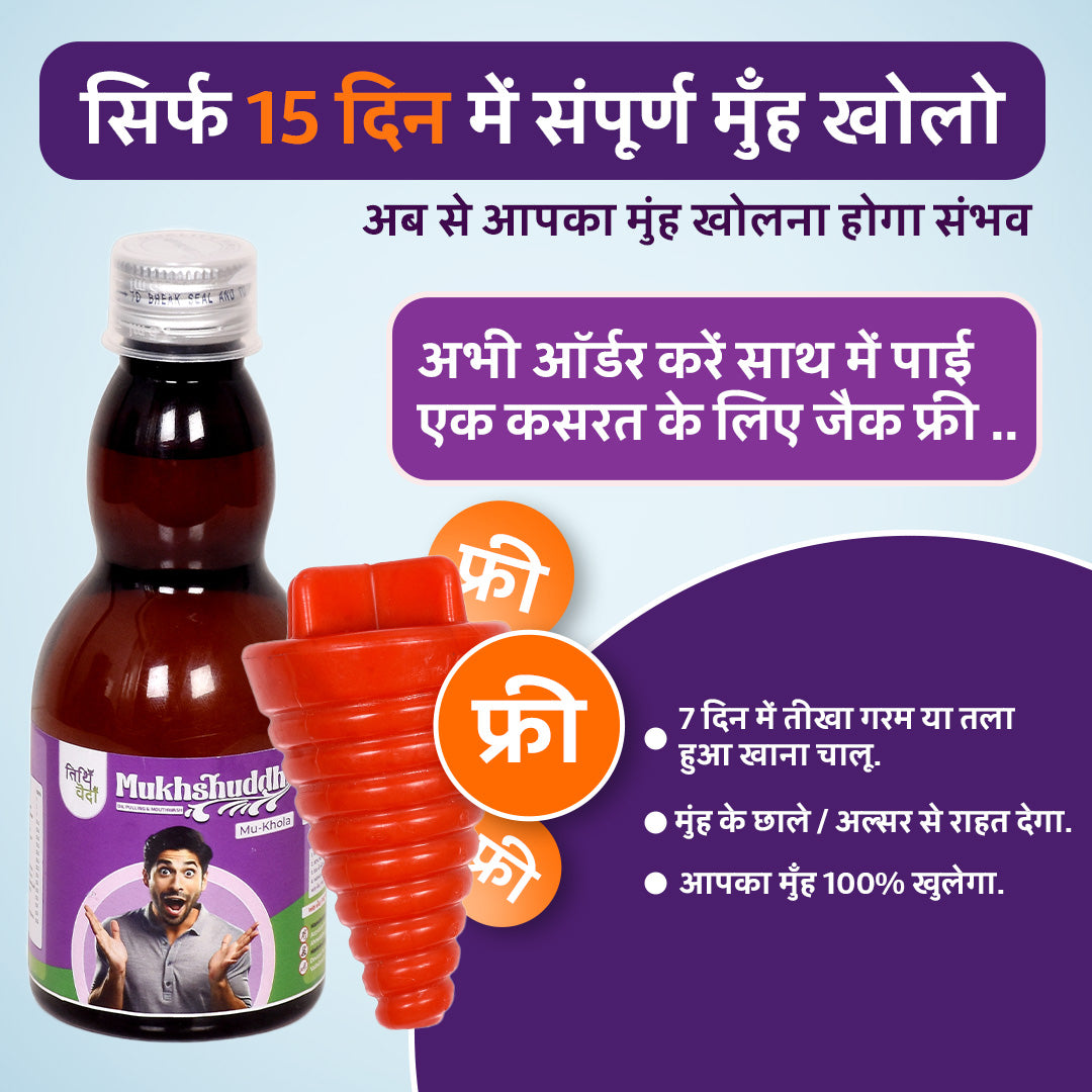 जो लोग तंबाकू, मावा या सुपारी का सेवन करते हैं, उन्हें अक्सर मुंह न खुलने, चाले होने या जलन जैसी समस्याओं का सामना करना पड़ता है। इन्हीं समस्याओं को ध्यान में रखते हुए हमने बनाया है – मुखशुद्धि।